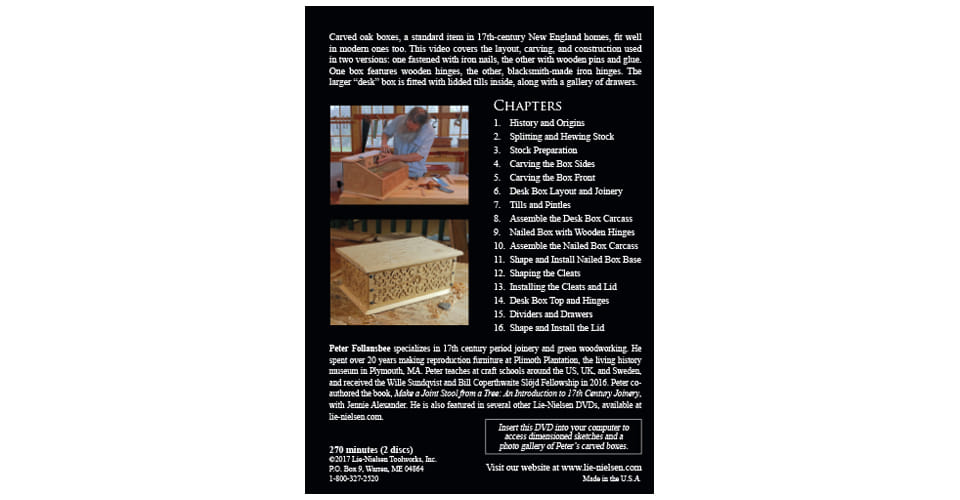 Carved oak boxes, a standard item in 17th century New England homes, fit well in modern ones too. This video covers the layout, carving and construction used in two versions: one box fastened with iron nails, the other with wooden pins and glue. One box features wooden hinges, the other, blacksmith-made iron hinges. The larger “desk” box is fitted with lidded tills inside, along with a gallery of drawers.