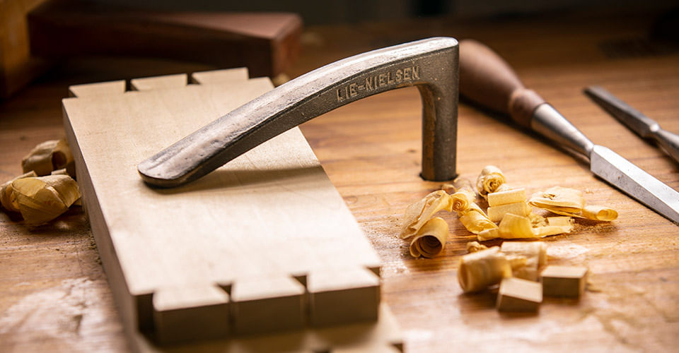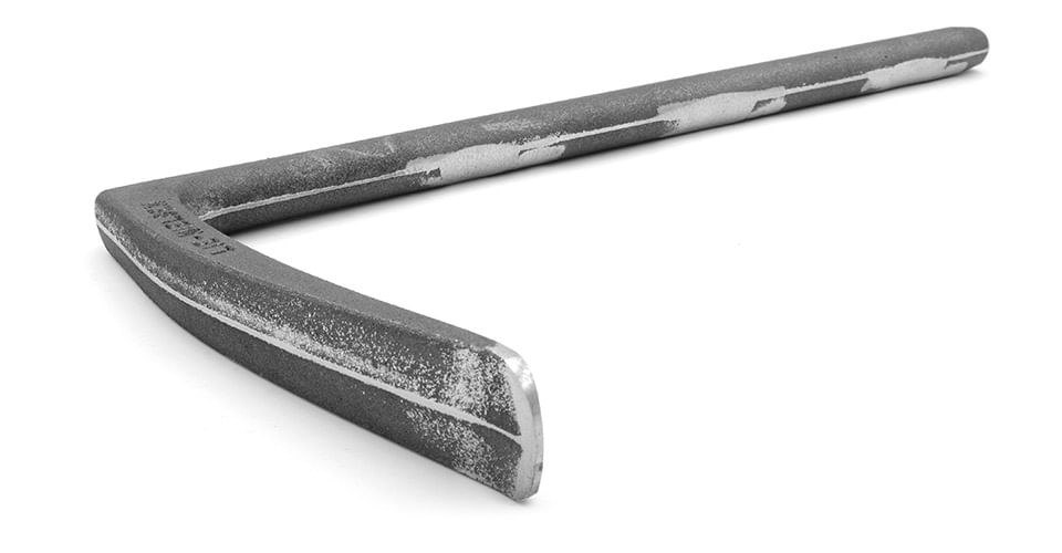 Inspired by the work of master blacksmith, Peter Ross. Cast Ductile Iron, hot oil finish. Fits a 3/4" diameter hole in a benchtop from 1-1/2" to 4" thick (if your benchtop is thicker, you may need to relieve the bottom third of the hole to 1" diameter). Low profile, flexible enough to grip the work firmly, but easily loosened with a mallet or hammer.