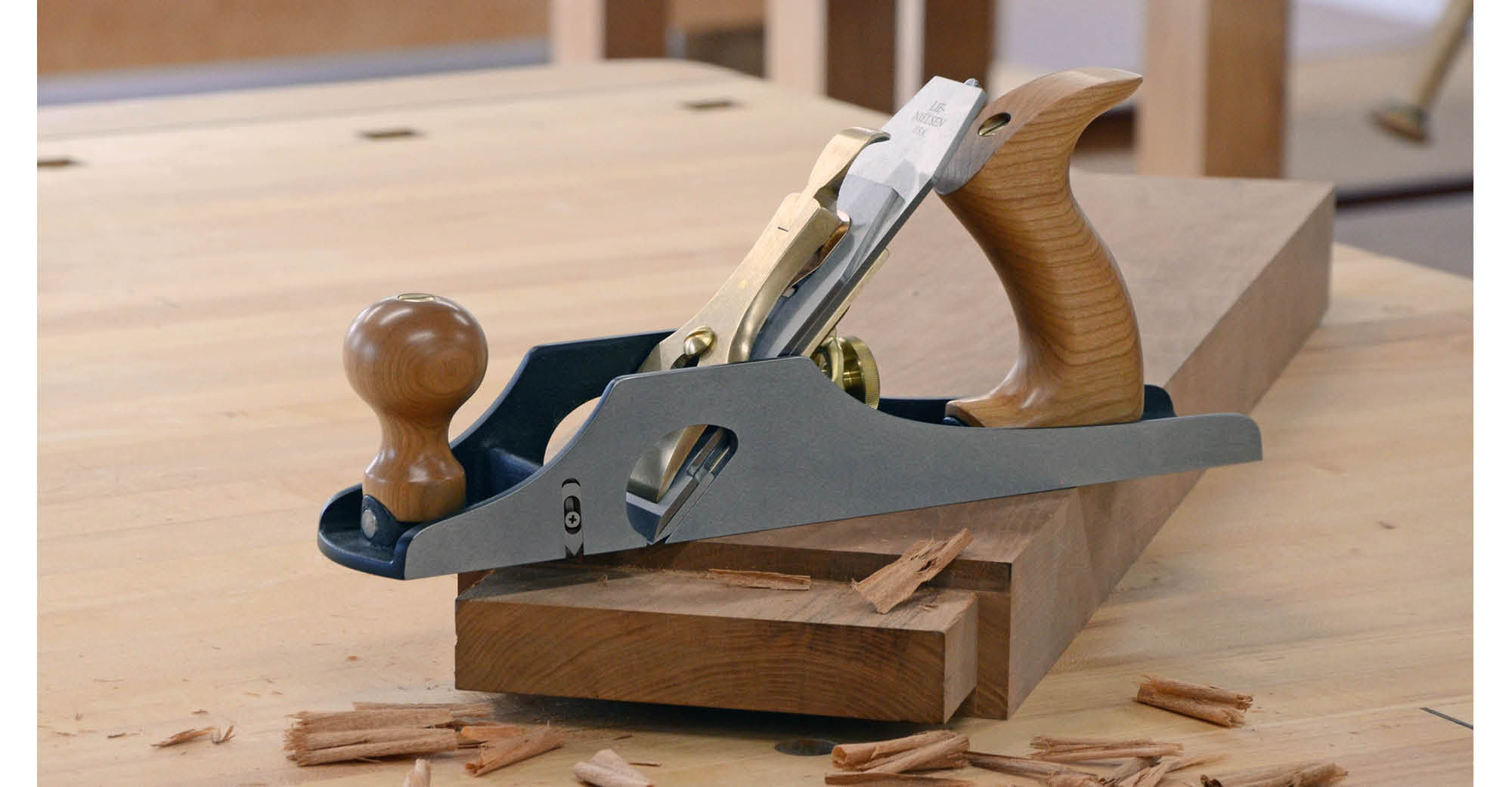 A Bench Rabbet Plane is very handy for working large rabbets and tenons, while also doubling as a Jack Plane. The Lie-Nielsen Bench Rabbet Plane is based on the Stanley Bedrock-type planes. Bedrocks were Stanley’s top line of Bench Planes, heavier and better made than the standard. In addition, the construction of the frog is unique — it features a fully machined fit between frog and body, adjustable from the rear without having to remove the blade and cap. This allows you to easily change the mouth setting from a coarse to a fine cut for difficult woods or fine smoothing passes. For heavy cuts, adjust the frog back so the blade rests directly on the plane body.