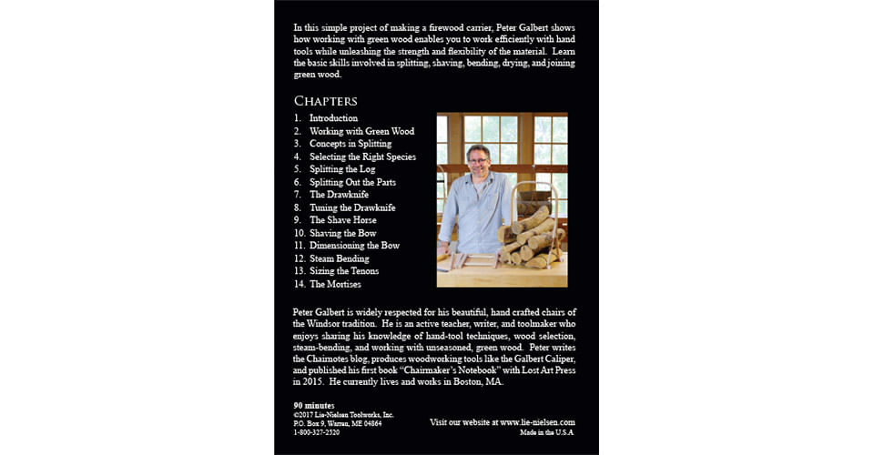In the process of building this Firewood Carrier, Peter Galbert shows how working with green wood enables you to work efficiently with hand tools while unleashing the strength and flexibility of the material. If you are interested in chairmaking, this video covers the basic skills involved in splitting, shaving, bending, drying, and joining green wood, which are the foundation of chairmaking.